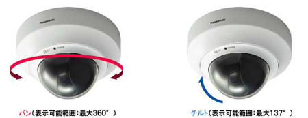 水平画角73°の広角レンズに加え、パン(水平方向)最大350°、チルト(垂直方向)最大82°の広角度のパン・チルト機構を搭載しています。パン・チルトの回転角度とレンズの画角を合わせて、表示可能範囲は水平方向で最大360°、垂直方向で最大137°となり、広い範囲をモニタリングすることができます。