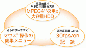 - MPEG-4+大容量HDDで高密度・長時間の録画運用。